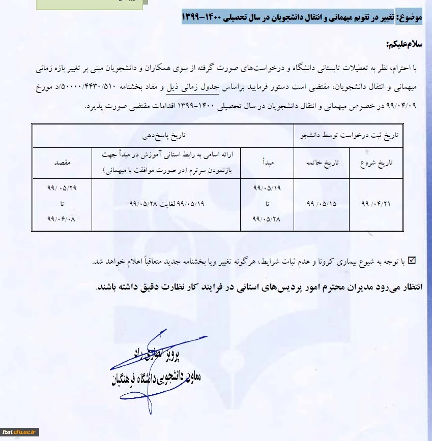 امتیاز دهید : تغییر در تقویم میهمانی و انتقال انشجویاندر سال تحصیلی 1400-1399 سهشنبه 7 مرداد 1399 ساعت 18:30