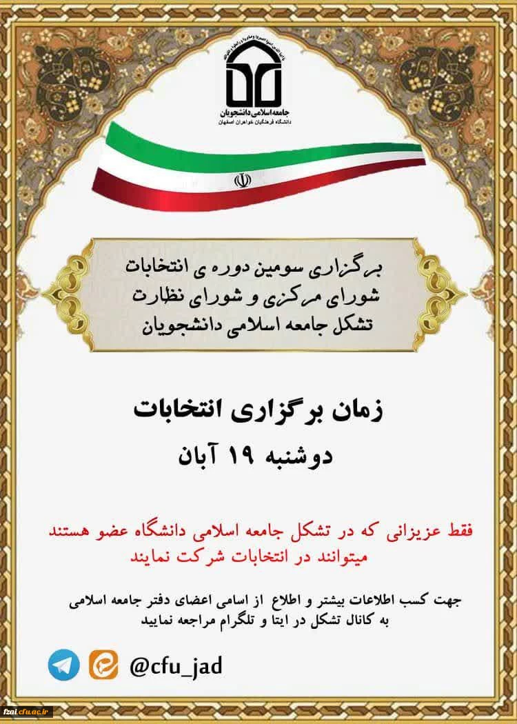 امتیاز دهید : برگزاری انتخابات تشکل جامعه اسلامی پردیس فاطمه زهرا(س) چهارشنبه 28 آبان 1399 ساعت 14:52