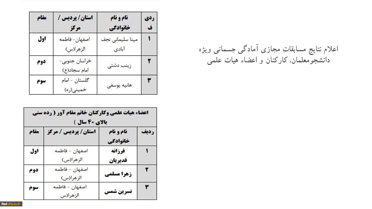 امتیاز دهید : اعلام نتایج مسابقات مجازی آمادگی جسمانی ویژه دانشجومعلمان، کارکنان و اعضاء هیات علمی شنبه 21 فروردین 1400 ساعت 8:14