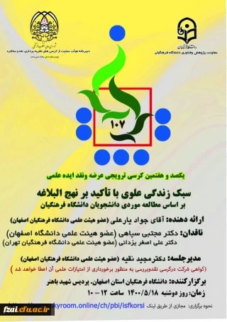 یکصد و هفتمین کرسی ترویجی عرضه و نقد ایده علمی با موضوع:*سبک زندگی علوی با تاکید بر نهج البلاغه بر اساس مطالعه موردی دانشجویان دانشگاه فرهنگیان *