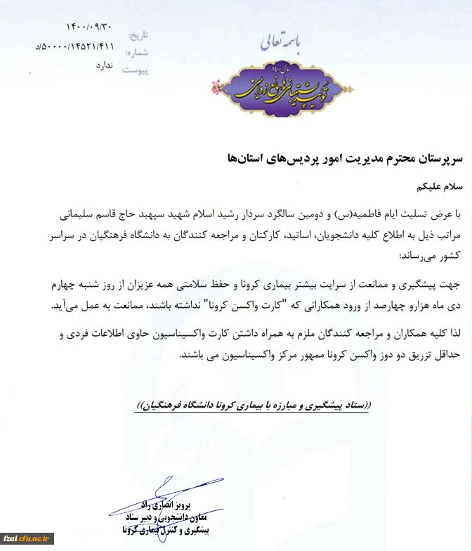 امتیاز دهید : لزوم داشتن کارت واکسن کرونا جهت ورود به سازمان مرکزی از تاریخ 1400/10/04 سهشنبه 7 دی 1400 ساعت 14:10