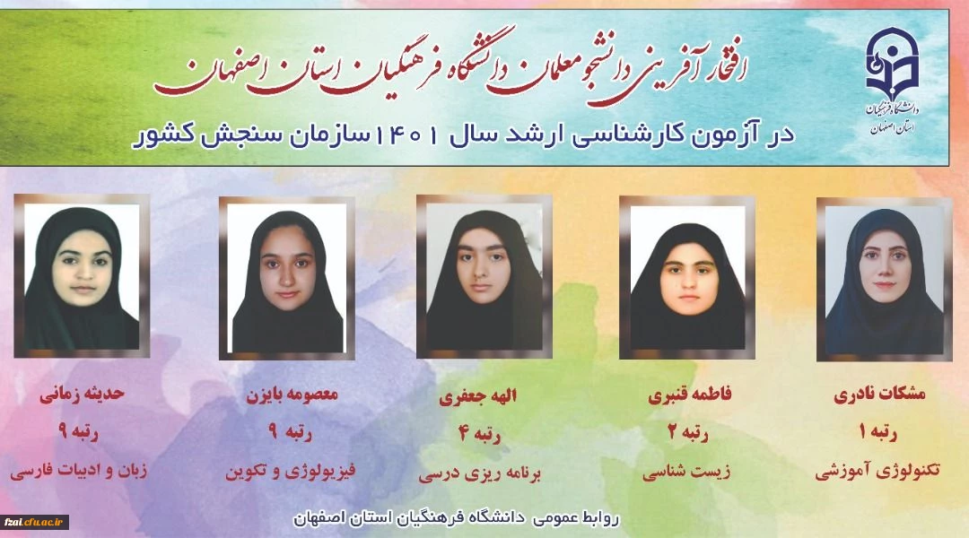 افتخار آفرینی دانشجویان دانشگاه فرهنگیان اصفهان در آزمون کارشناسی ارشد سال 1401سازمان سنجش کشور