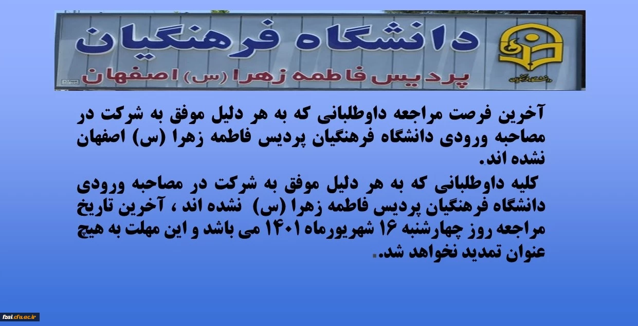 آخرین فرصت مراجعه داوطلبانی که به هر دلیل موفق به شرکت در مصاحبه ورودی دانشگاه فرهنگیان پردیس فاطمه زهرا (س) اصفهان نشده اند