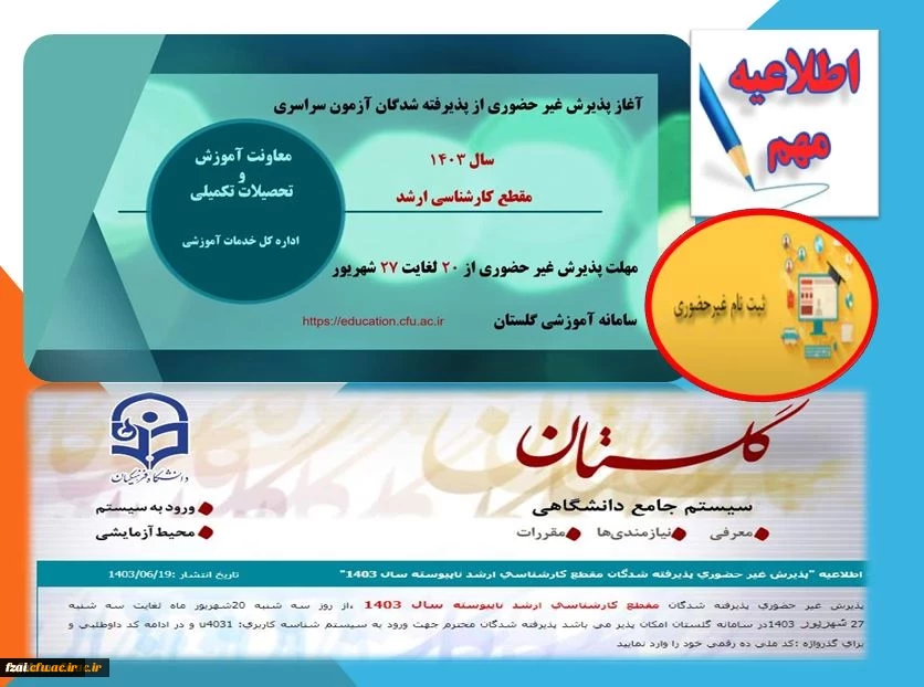 امتیاز دهید : آغاز پذیرش غیر حضوری از پذیرفته شدگان آزمون سراسری سال ۱۴۰۳ در مقطع کارشناسی ارشد چهارشنبه 21 شهریور 1403 ساعت 9:18